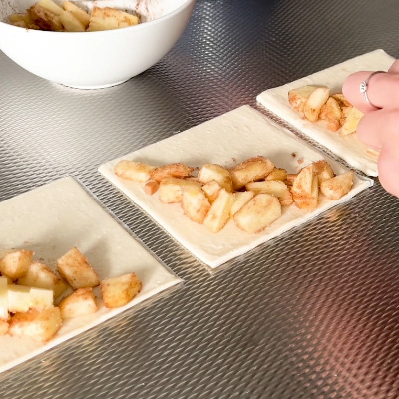 - Meng de appel in een kom samen met 2 theelepels suiker, 2 theelepels kaneel en de mini fudge.