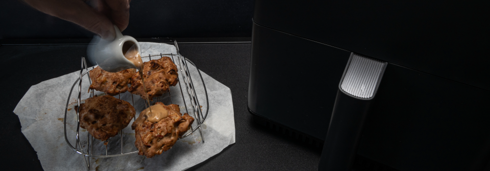 - Wanneer de baktijd om is, haal je de appelkoekjes uit de airfryer en leg je ze op een rooster.