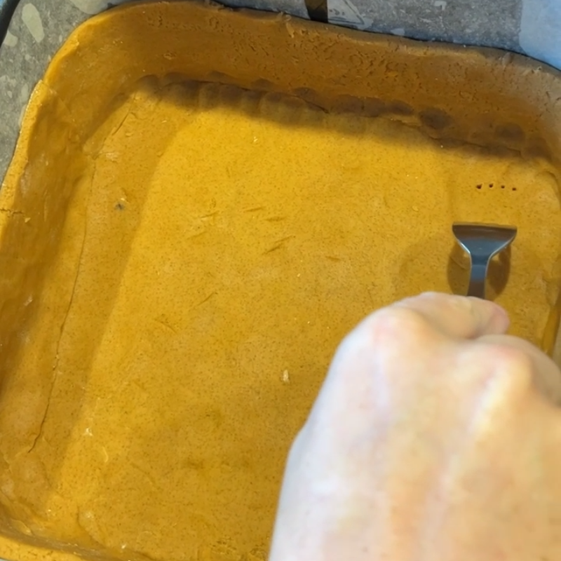 - Gebruik 2/3e van het deeg voor de bodem en de zijkanten. Bewaar het overige deeg voor de bovenkant.