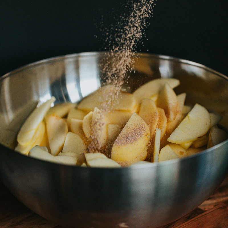 - Schil de appels en meng deze met de kaneel en de suiker.