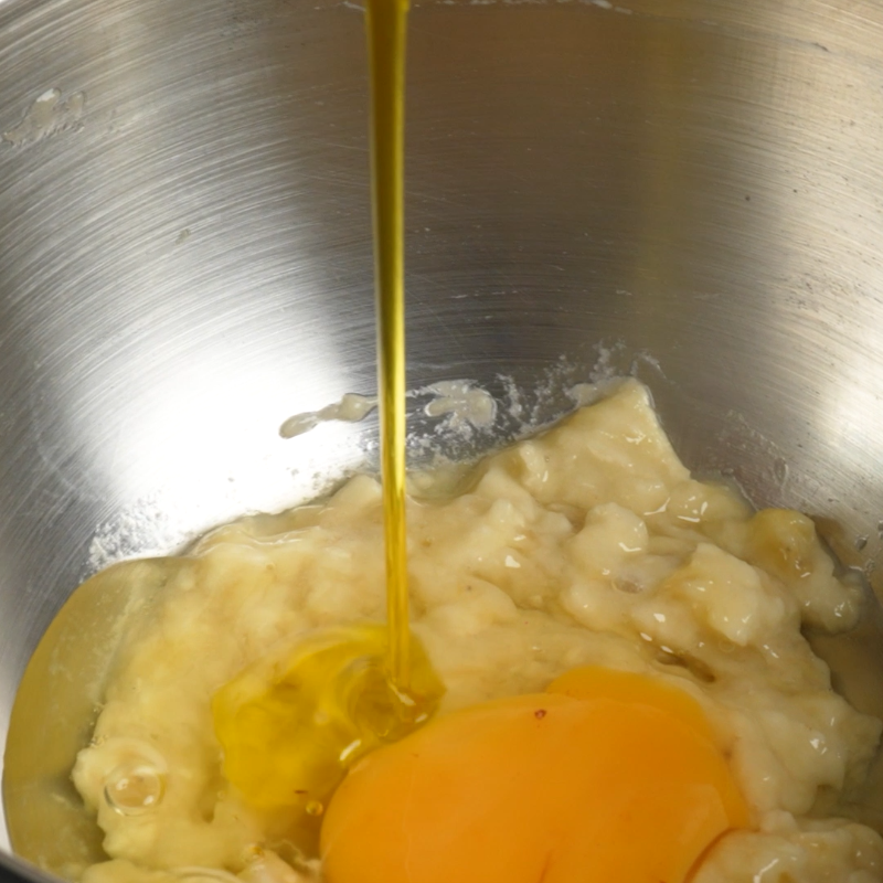 Meng met een garde de bananenpuree, eieren, olie, boter en suiker tot een glad mengsel.