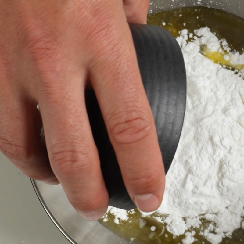 Meng de droge ingrediënten (bloem, zout en bakpoeder) door het natte mengsel met een spatel tot alles gelijkmatig is gemengd.