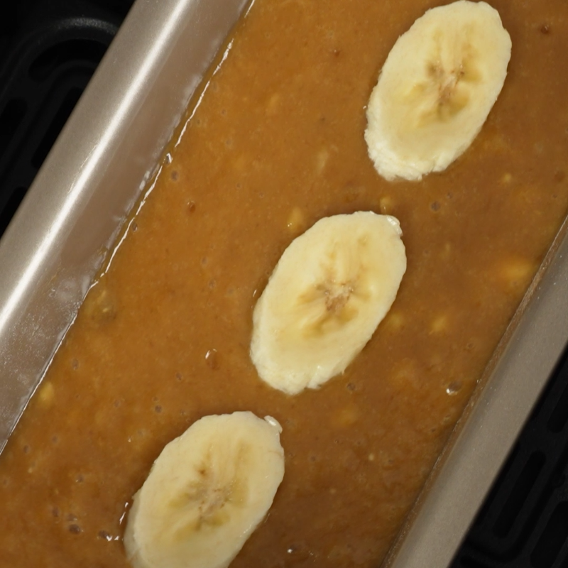 Giet het mengsel in de voorbereide broodvorm en leg wat plakjes banaan bovenop het beslag ter decoratie. Druppel een beetje honing over de banaan. (Optioneel)