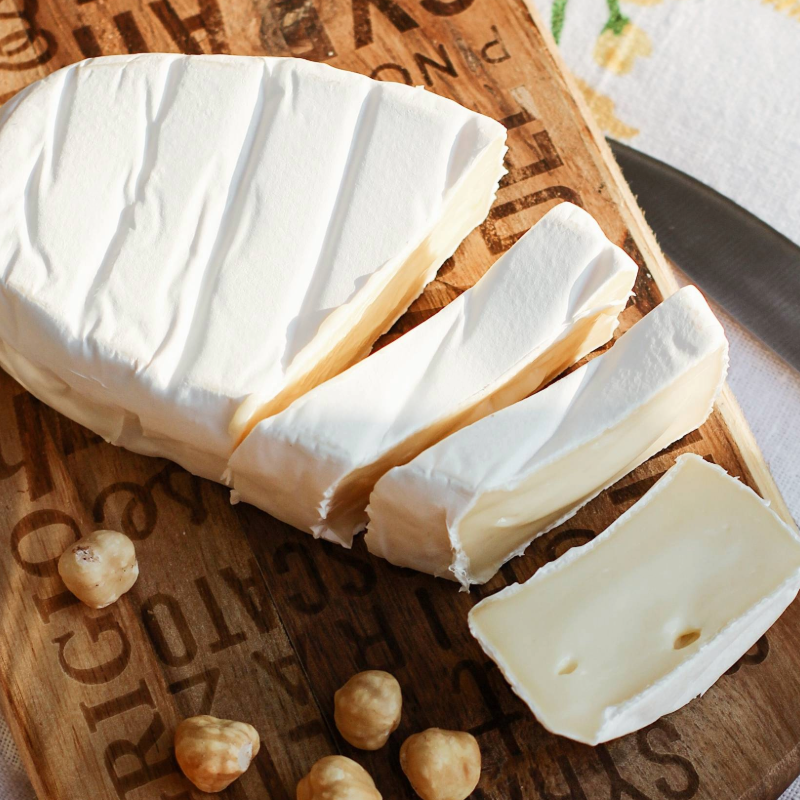 - Leg op de 5 plakjes een klein plakje brie. Zorg ervoor dat ze niet buiten het bladerdeeg plakje vallen.