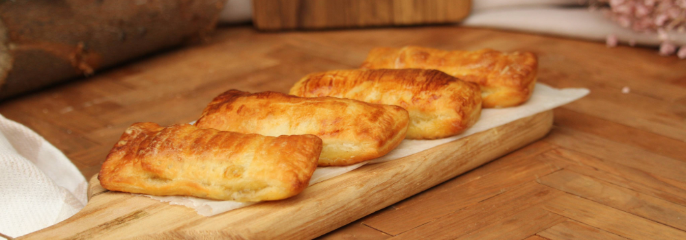 - Snijd de plakjes bladerdeeg doormidden zodat je 10 stukjes hebt.