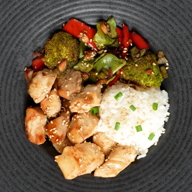 Serveer de kip en groenten samen met de rijst en garneer eventueel met extra bosui of sesamzaadjes.
