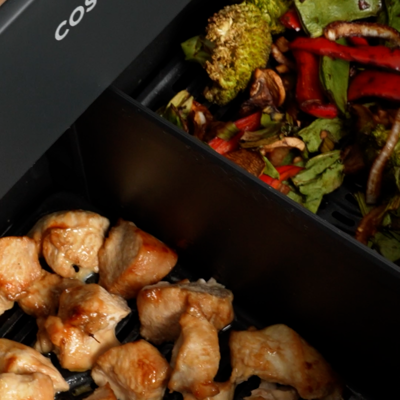 Plaats de gemarineerde kip in het eerste mandje van de airfryer. Selecteer Zone 1 en de Air Fry-functie, stel de temperatuur in op 180°C en de tijd op 10 minuten.