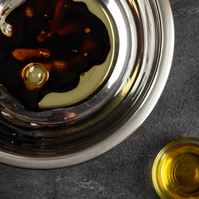 Meng in een kom de sojasaus, mirin, rijstazijn, sesamolie en suiker tot een marinade voor de kip.