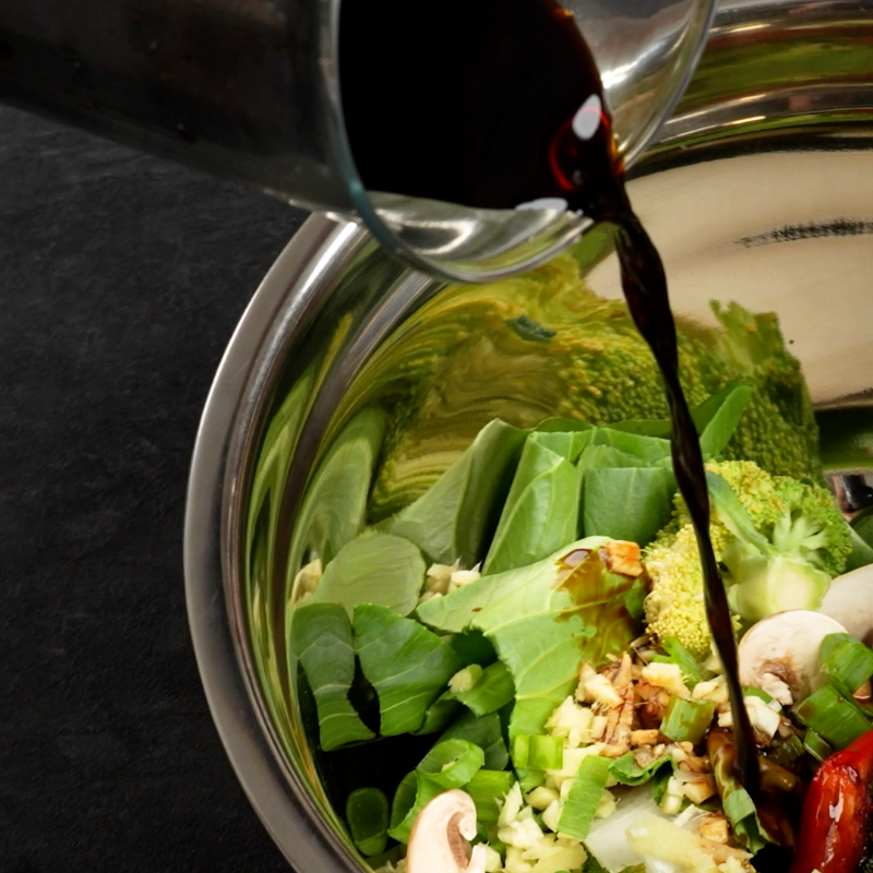 Breng de groenten op smaak met gehakte knoflook, gember, bosui en sojasaus.
