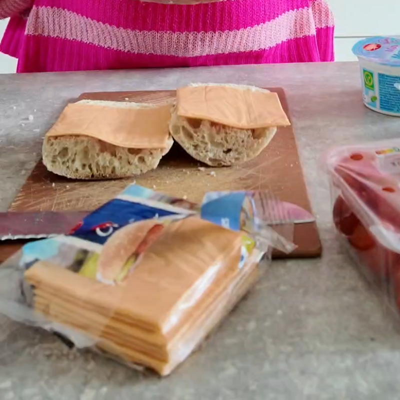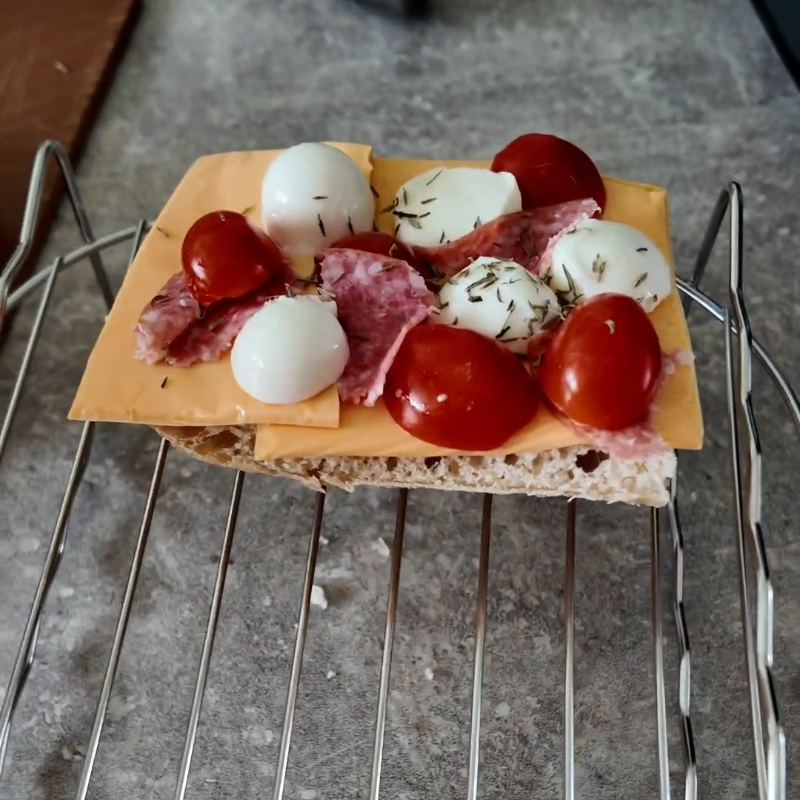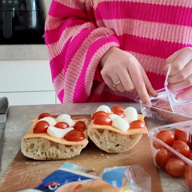 Beleg de ciabatta per broodje met 1,5 plakje cheddar, 2 gesneden mozzarella bolletjes, 8 stukjes van de gesneden cherrytomaatjes en een half plakje salami in stukjes