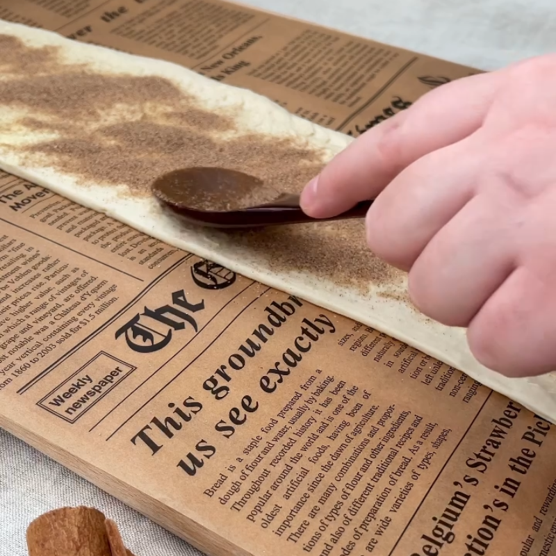 - Meng de basterdsuiker en kaneel, strooi dit gelijkmatig over het deeg. Verdeel daarna de rozijnen hier overheen.