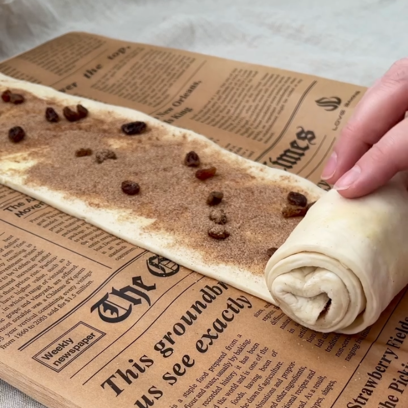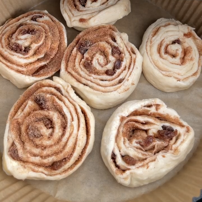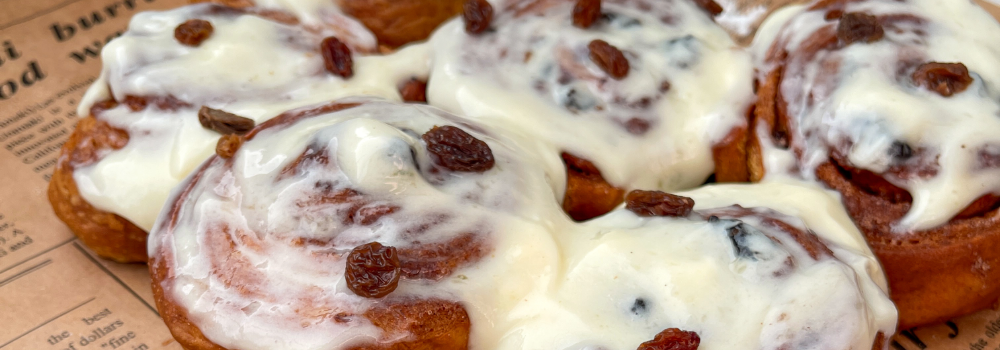- Smeer het glazuur over de afgekoelde cinnamon rolls en top ze af met extra rozijnen.