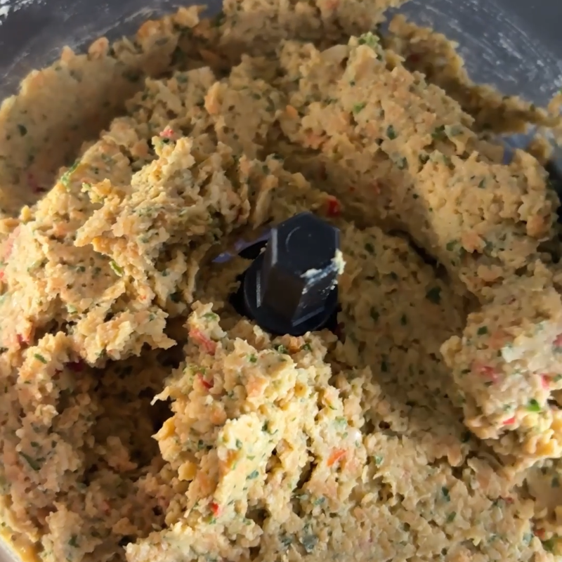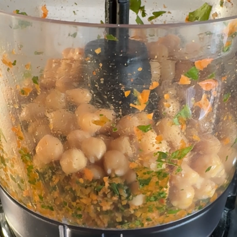 Voeg de kikkererwten en bloem toe en maal tot een stevig mengsel.