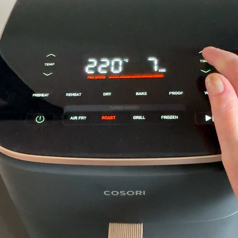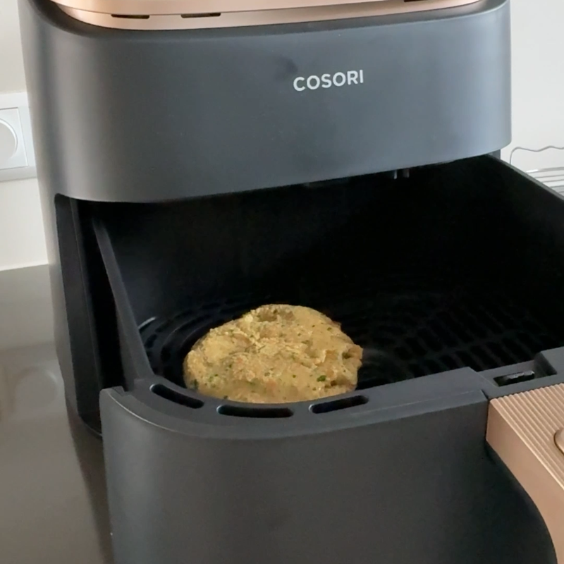 Stel de airfryer in op de roast stand, 220°C. Bak de burgers 7 minuten, draai ze om en bak nog eens 7 minuten.