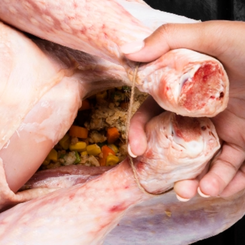 - Steek de ui, knoflook, wortel, boter en de takjes rozemarijn afwisselend in de holte van de kip. Op deze manier worden de smaken goed verdeeld.