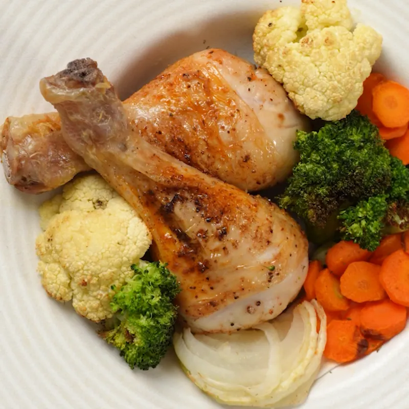 Sluit het mandje en laat de rest van het programma aflopen. Haal de kip en geroosterde groenten uit de airfryer zodra ze gaar zijn.