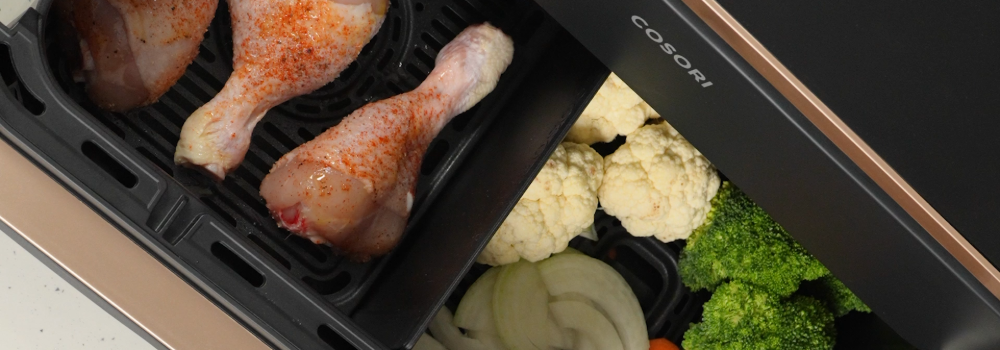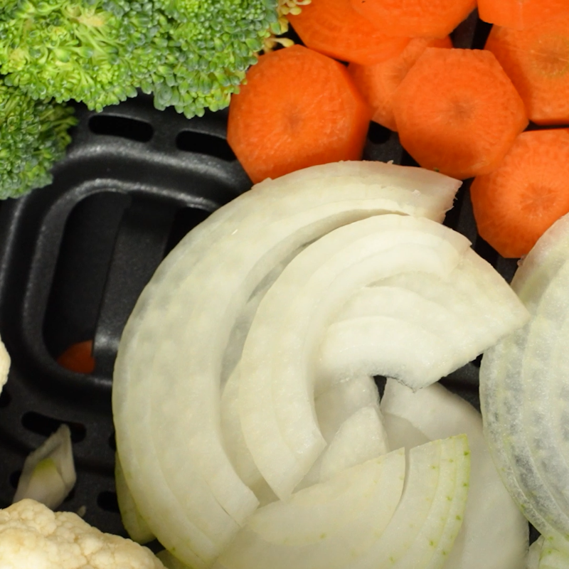 Verspreid de gekruide groenten gelijkmatig in het tweede mandje van de airfryer. Stel beide zones in op Roast-modus met behulp van de Match-functie, op 200°C voor 20 minuten.