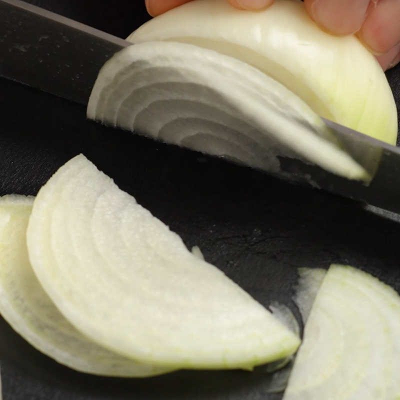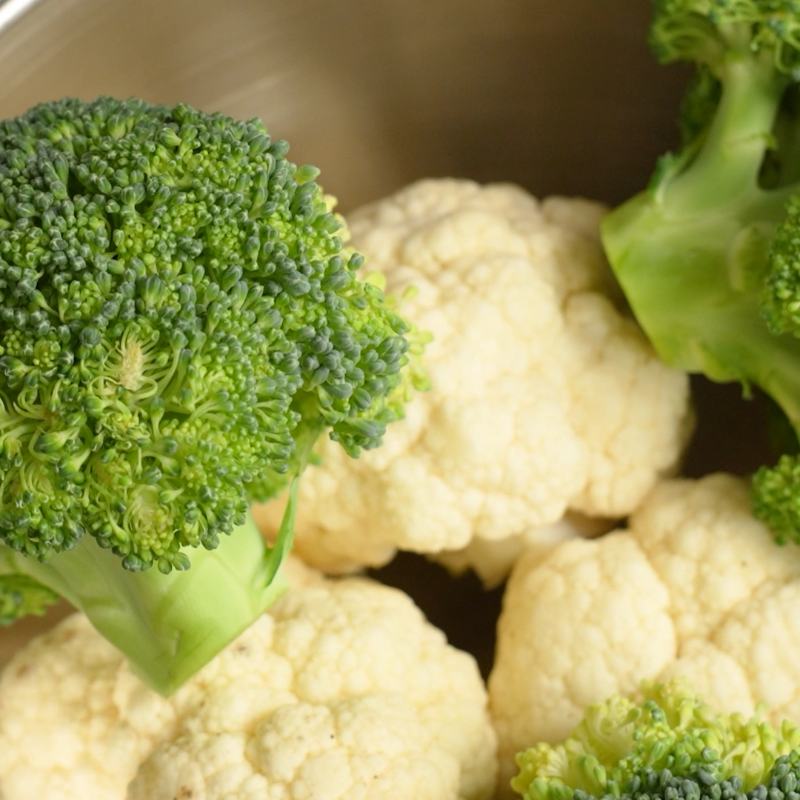 Snijd de groenten in plakjes en leg de broccoli- en bloemkoolroosjes klaar.