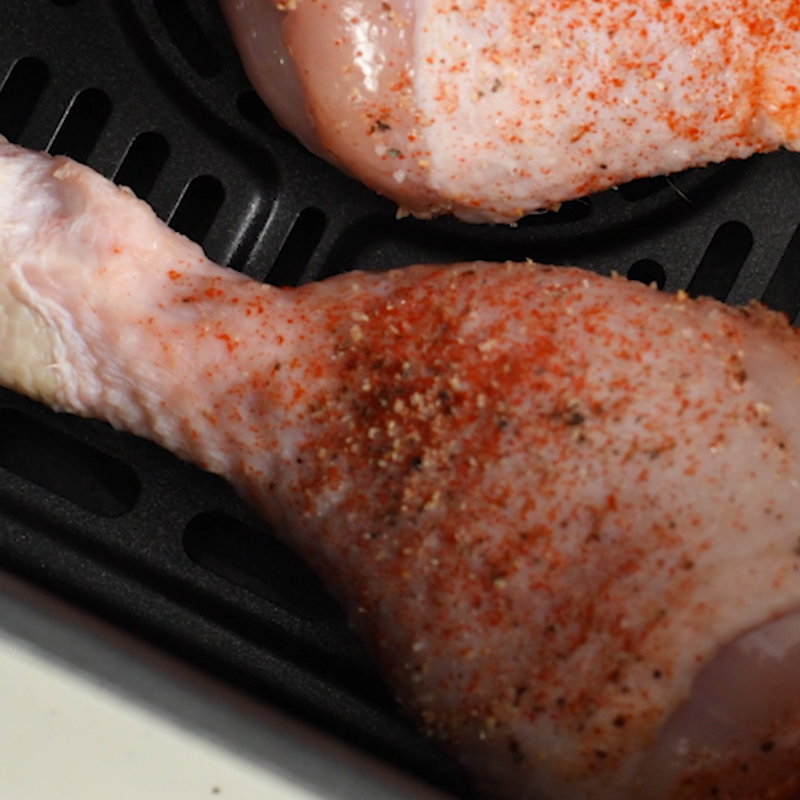 Leg de gekruide kippenpoten met de huid naar beneden in het eerste mandje van de airfryer.