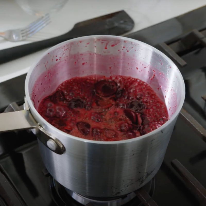 Combineer de kersen, het citroensap, de suiker en het zout in een steelpan op middelhoog vuur. Breng het mengsel aan de kook, verlaag dan het vuur en laat 5 minuten sudderen. Plet de kersen met een vork wanneer ze zacht zijn.
