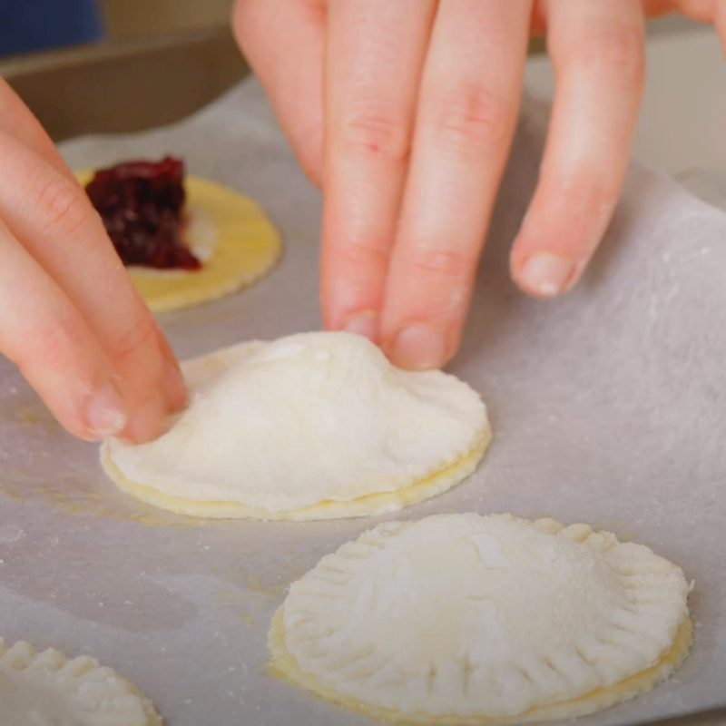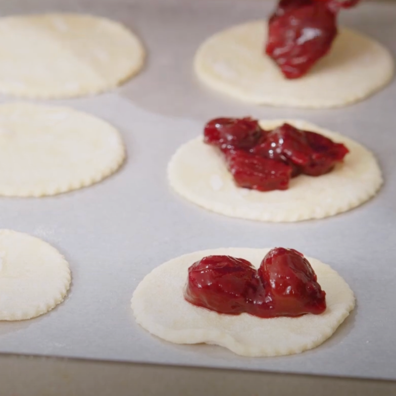 Schep ongeveer 2 theelepels kersenvulling op de ene helft van de cirkels. Bestrijk de randen met wat van het losgeklopte ei en plaats de resterende bladerdeegcirkels erop om te sluiten. Druk de randen aan met een vork om te verzegelen. Zet de gebakjes 20 minuten in de koelkast.