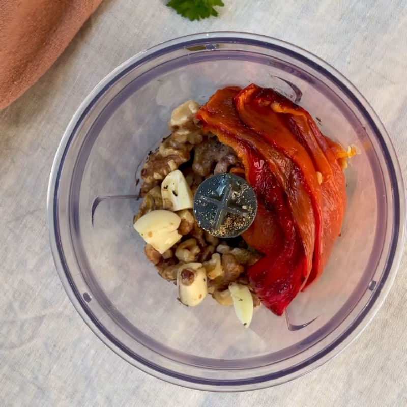 - Doe de gegrilde paprika’s samen met knoflook, walnoten, tomatenpuree, komijn, granaatappelsiroop (of citroensap), olijfolie, peper en zout in een keukenmachine of blender.