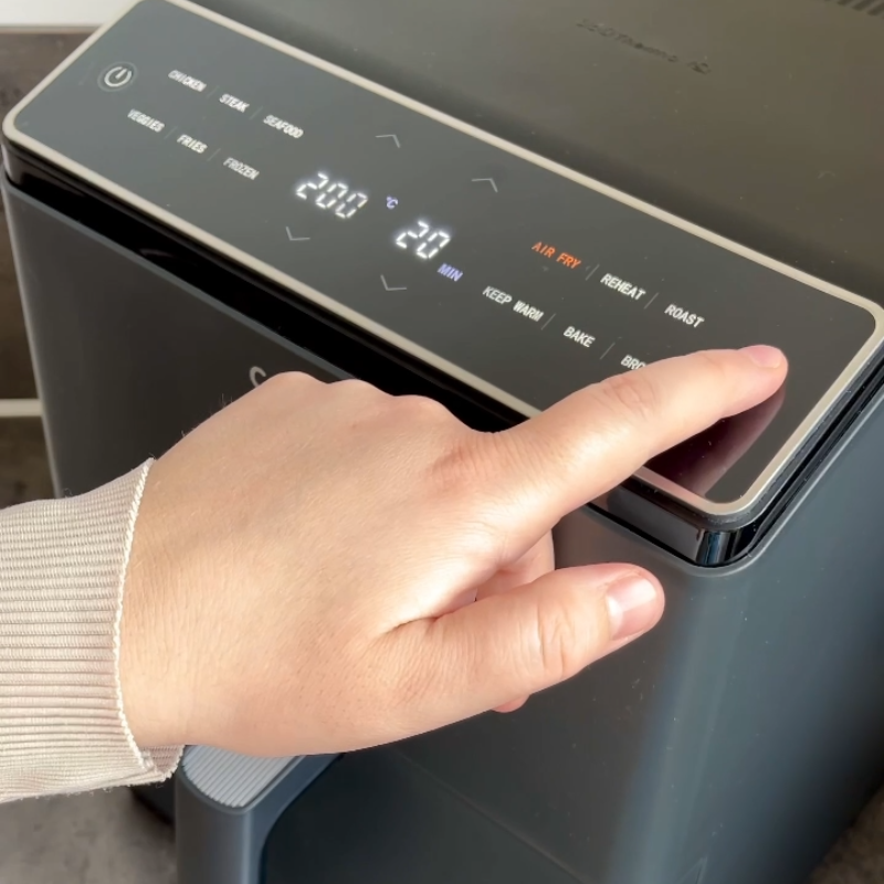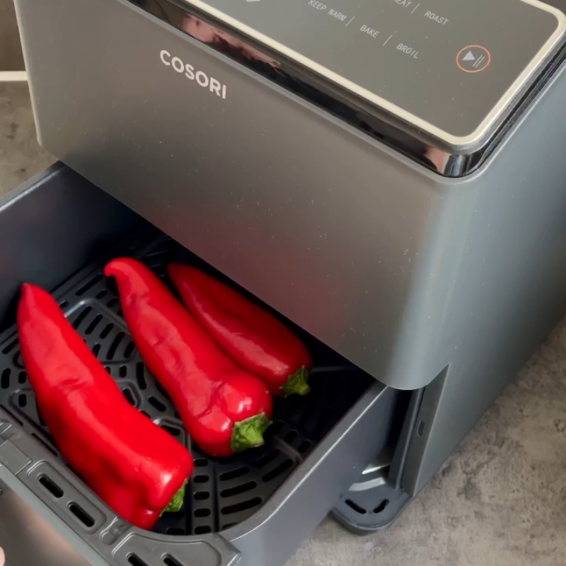 - Grill de rode puntpaprika’s in de Cosori airfryer op de Air Fry stand op 200 graden gedurende 20 minuten.