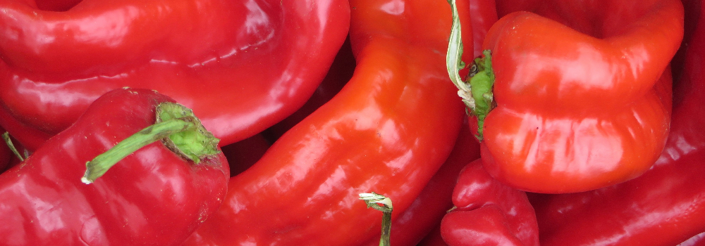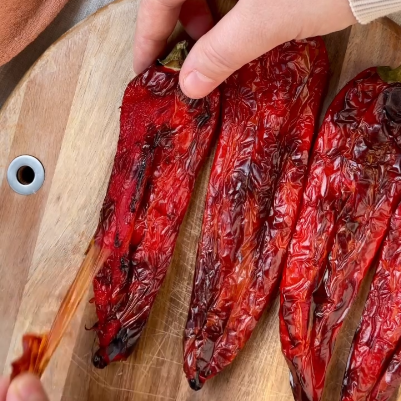 - 4 rode puntpaprika’s (in totaal ca. 300 gram), gegrild en ontveld