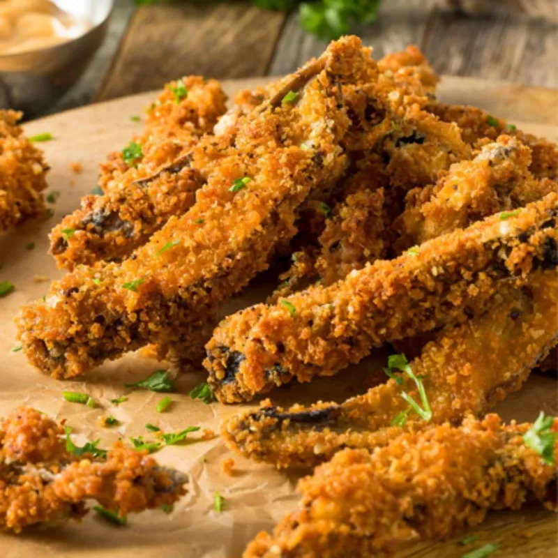 Haal de paddenstoelen frietjes eruit wanneer ze klaar zijn. Herhaal het kookproces met de resterende paddenstoelenrepen.