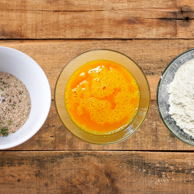 Zet de volgende kommen klaar: - Een kom met bloem - Een kom met de geklopte eieren - Een kom met de panko, het Italiaanse paneermeel, de Parmezaanse kaas en het zout.