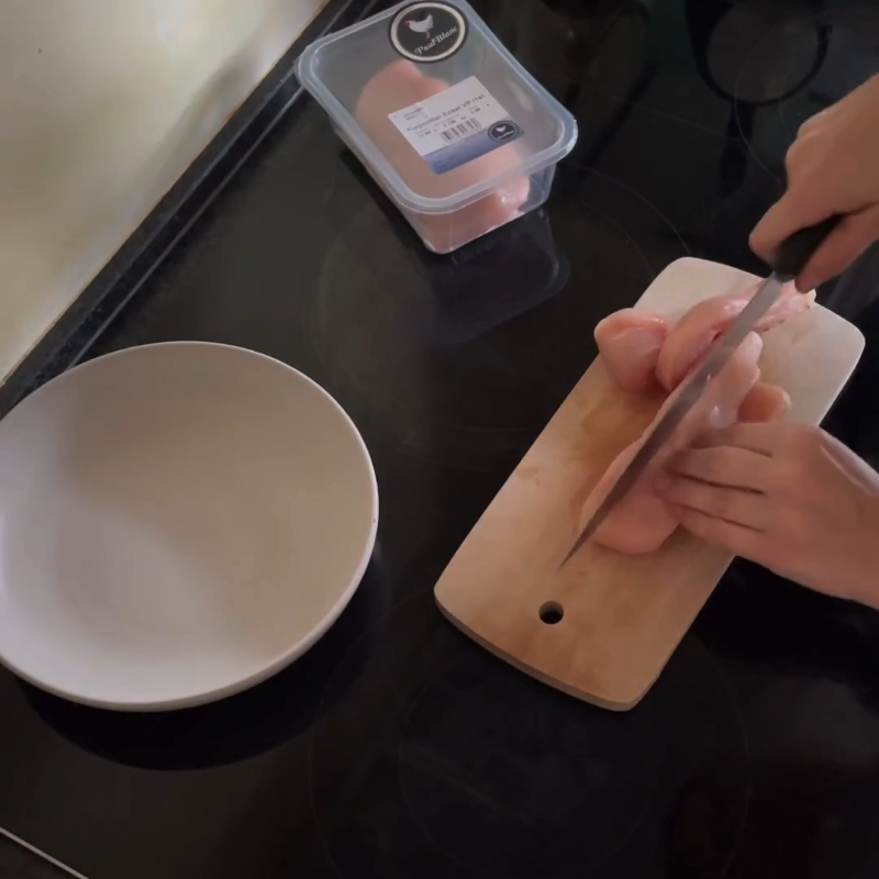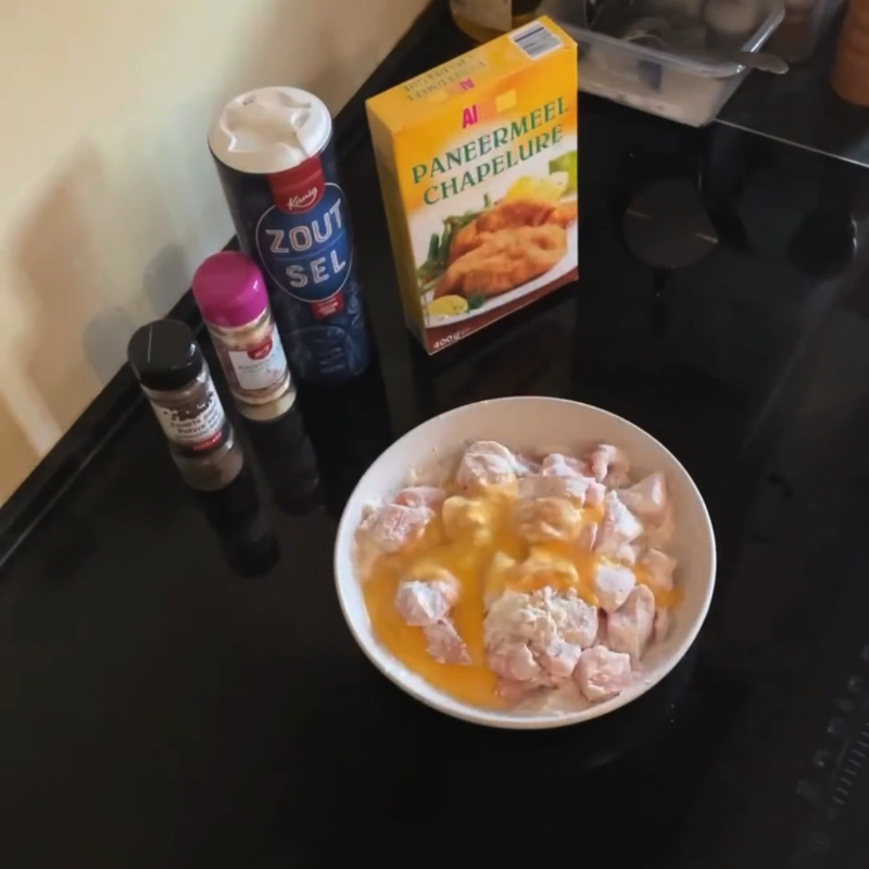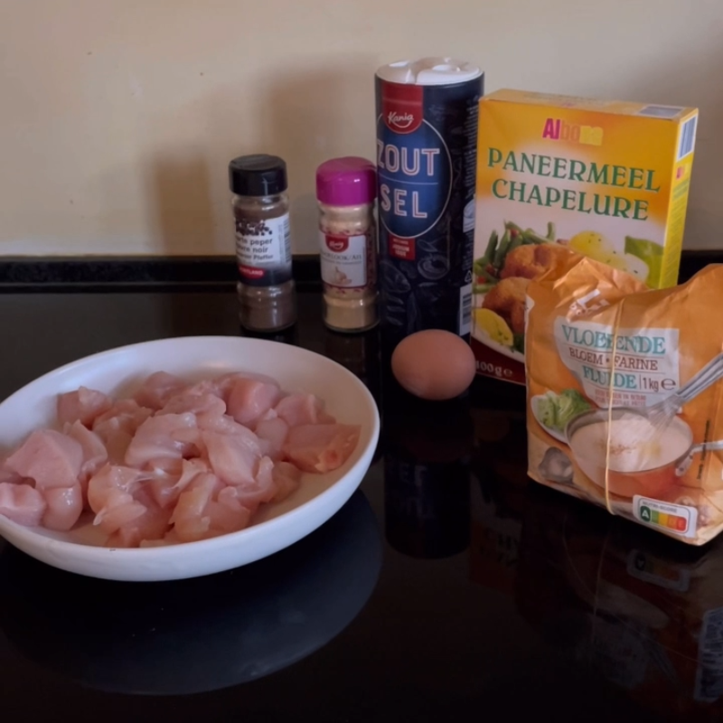 Meng in een kom de kipblokjes, bloem en het ei door elkaar zodat alle kipblokjes bedekt zijn.