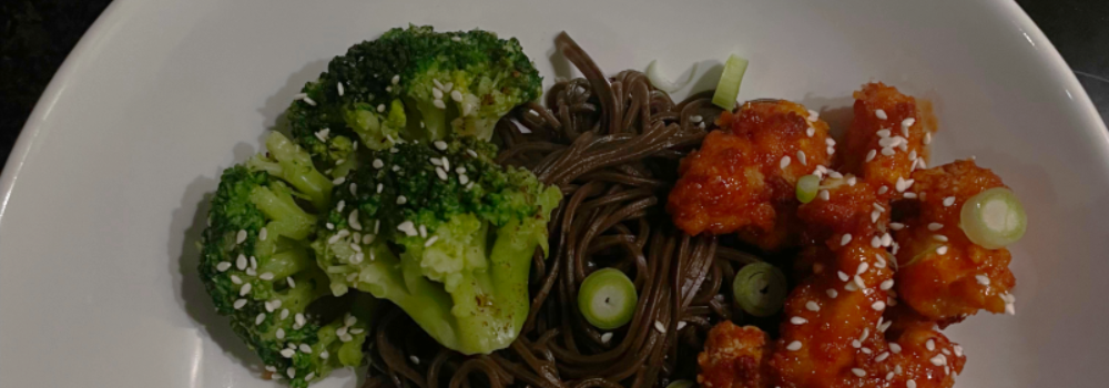 Kook ondertussen de broccoli en de noodles en maak de dressing. Meng de sesamolie, soja saus, honing, zoete chili saus en de sriracha in een kommetje goed door elkaar, zodat je een mooie saus krijgt.
