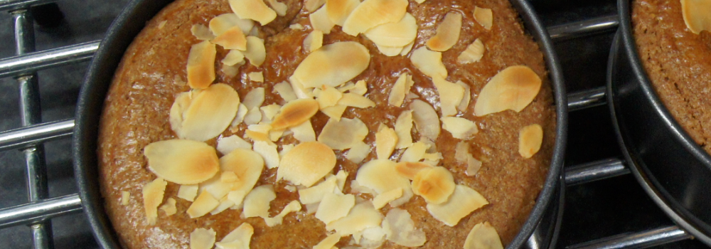 Druk het geheel voorzichtig goed aan en decoreer met de amandelen. Bestrijk de bovenkant met het overgebleven eimengsel.