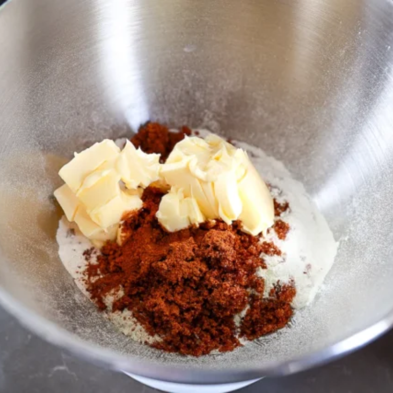 Zeef de bloem, het bakpoeder, de speculaaskruiden en een mespunt zout in een kom.