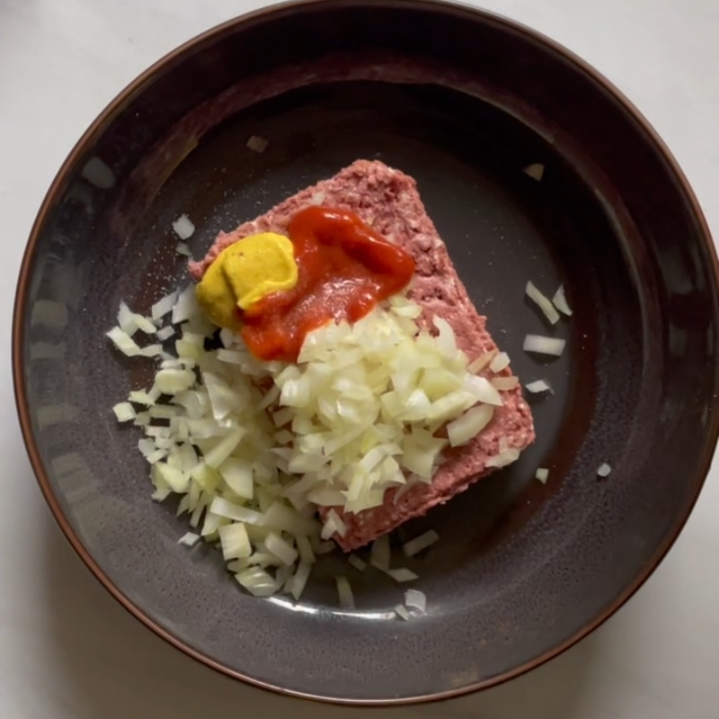 - Meng in een grote kom het gehakt met de ui, mosterd, ketchup, peper en zout. Kneed alles kort door elkaar.