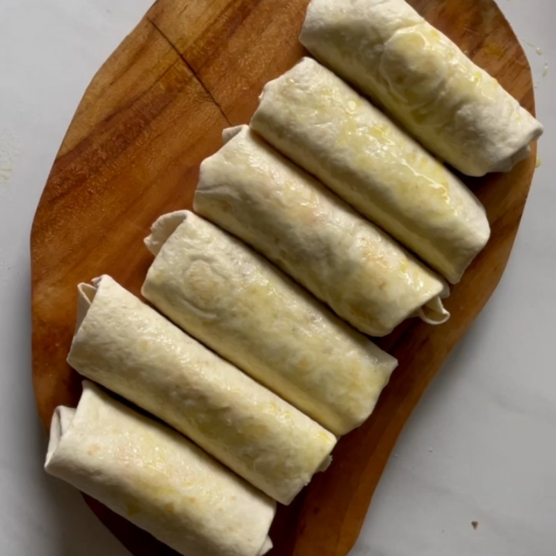 - Smeer de bovenkant in met een beetje van het bloem/water mengsel, dit zorgt ervoor dat je wrap dicht blijft.
