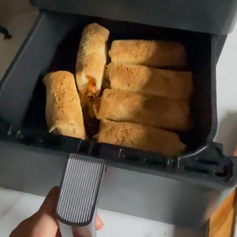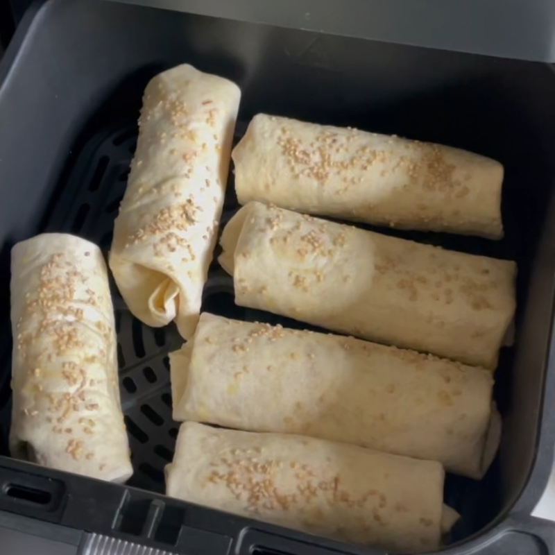 - Smeer je wraps in met een beetje olie, verdeel er wat sesamzaadjes over en leg op de crisp plaat van de airfryer.