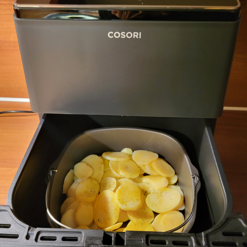 - Doe de aardappelschijfjes in de lade van de airfryer, breng op smaak met zout en peper en besprenkel de schijfjes met wat olijfolie.