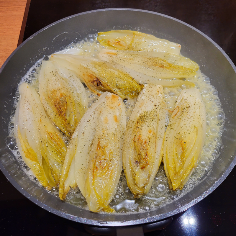 - Leg de witlof met de snijvlakken omlaag in de koekenpan en laat 3 minuten karamelliseren.