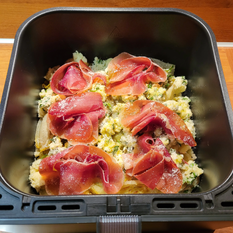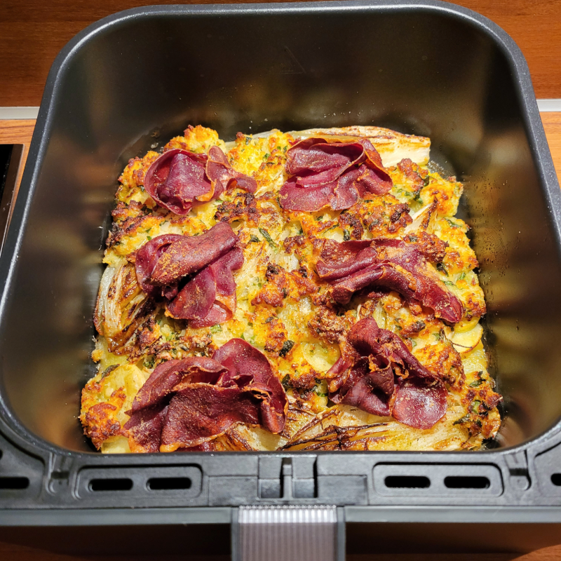 - Wanneer de aardappelschijfjes klaar zijn, trek je de lade uit de airfryer en leg je de dunne plakjes knoflook, de kabeljauwfilets en de gekaramelliseerde witlofstronkjes bovenop de aardappelschijfjes.