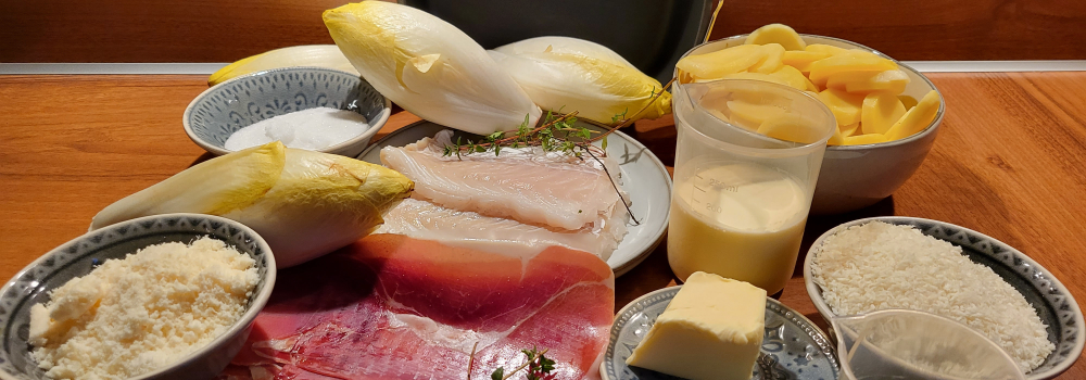 - Schenk hier het mengsel van de slagroom en Parmezaanse kaas overheen. Rol de serranoham losjes op en leg deze "roosjes" bovenop de kabeljauw en de halve witlofstronkjes.