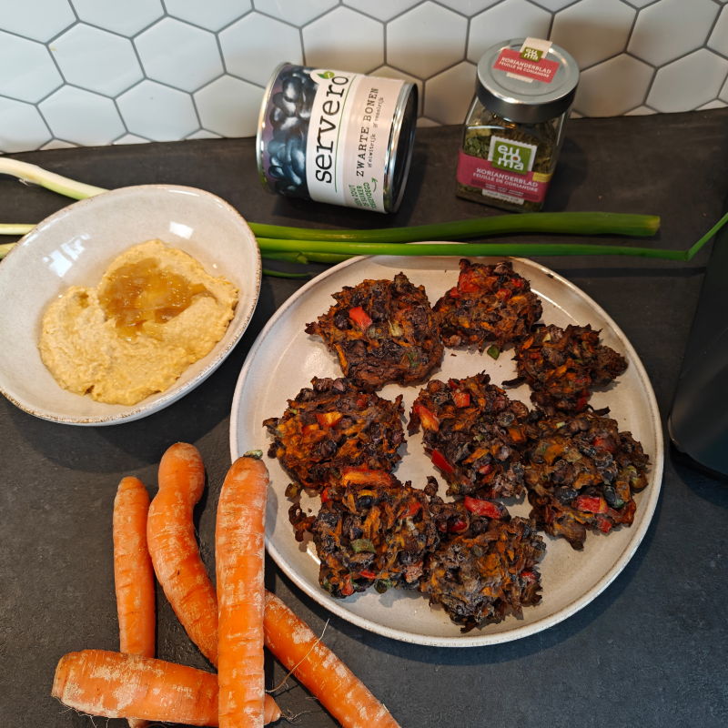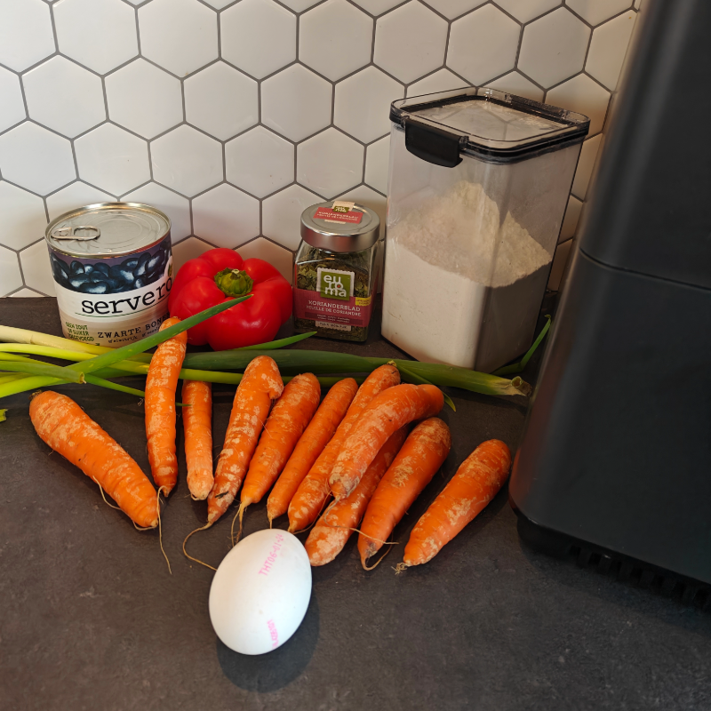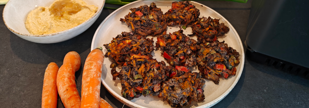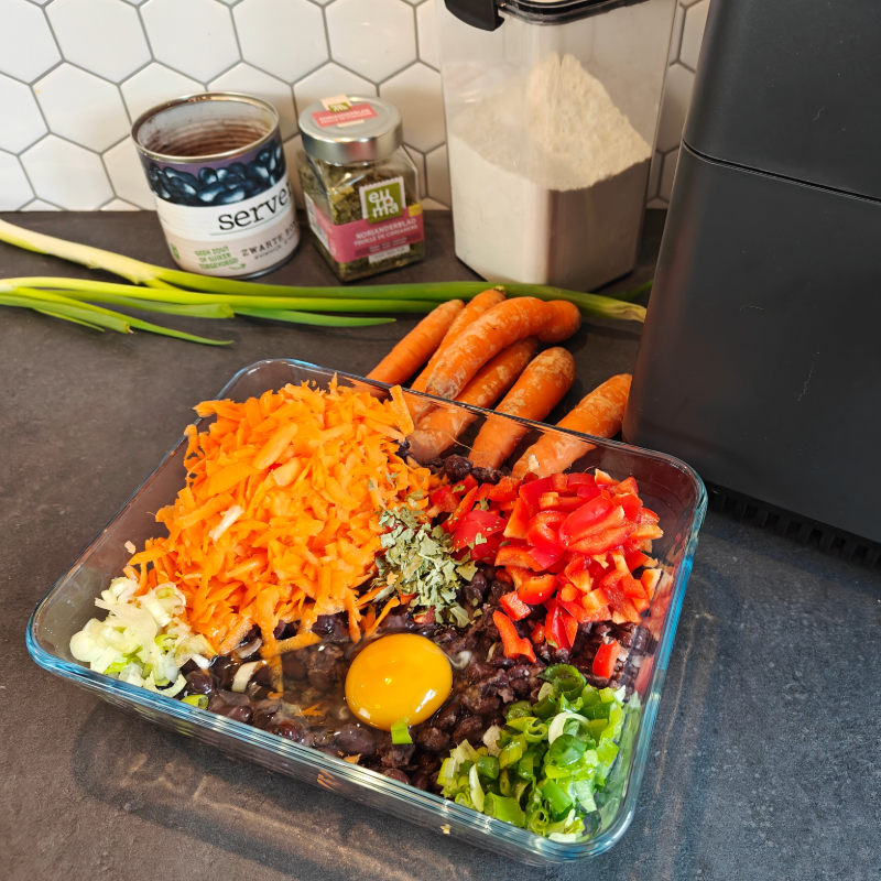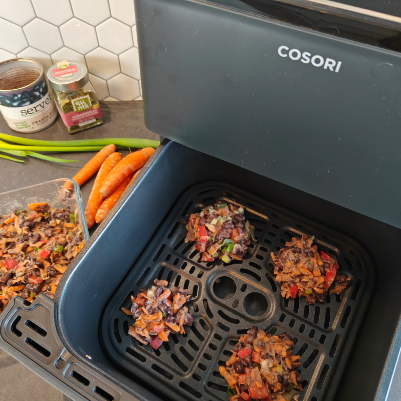 - Druk met je handen kleine burgers van het mengsel en leg deze direct in de airfryer. Het kan zijn dat je ze in meerdere stappen moet afbakken.