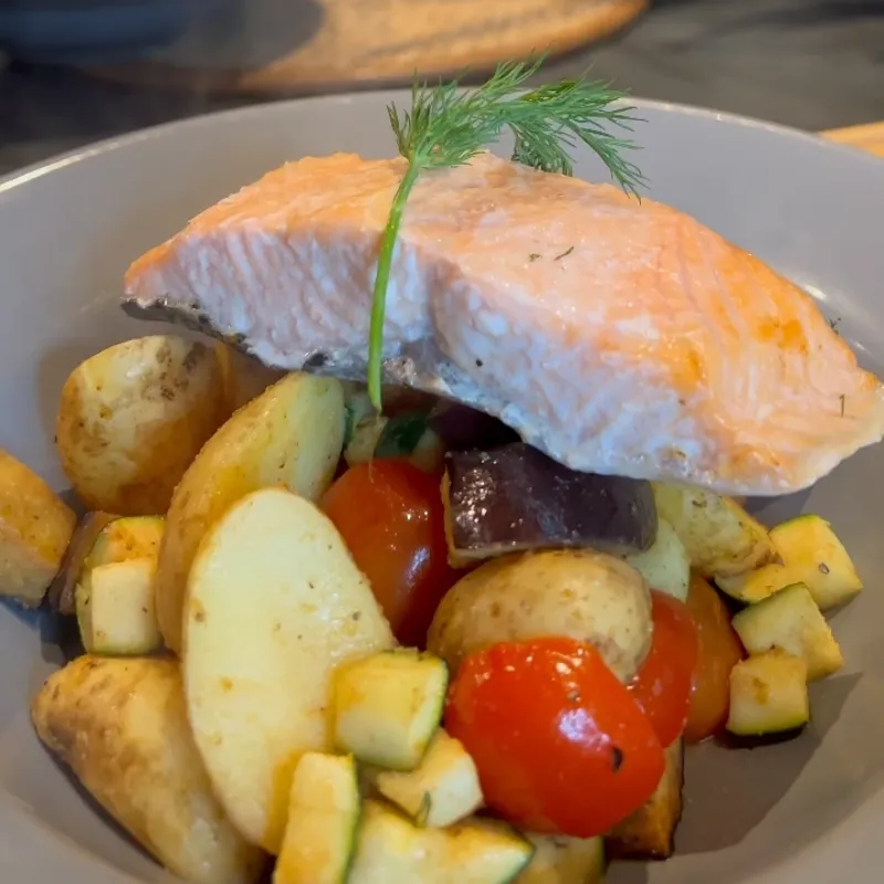- Verdeel de groenten over twee borden en leg op elk bord een zalmfilet.