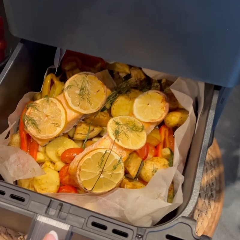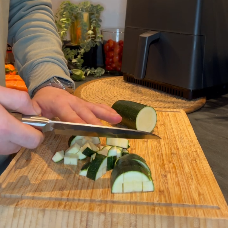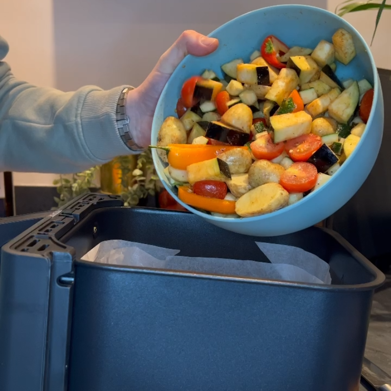 - Zet de airfryer op de stand "Airfry" op 180 graden voor 18 minuten.