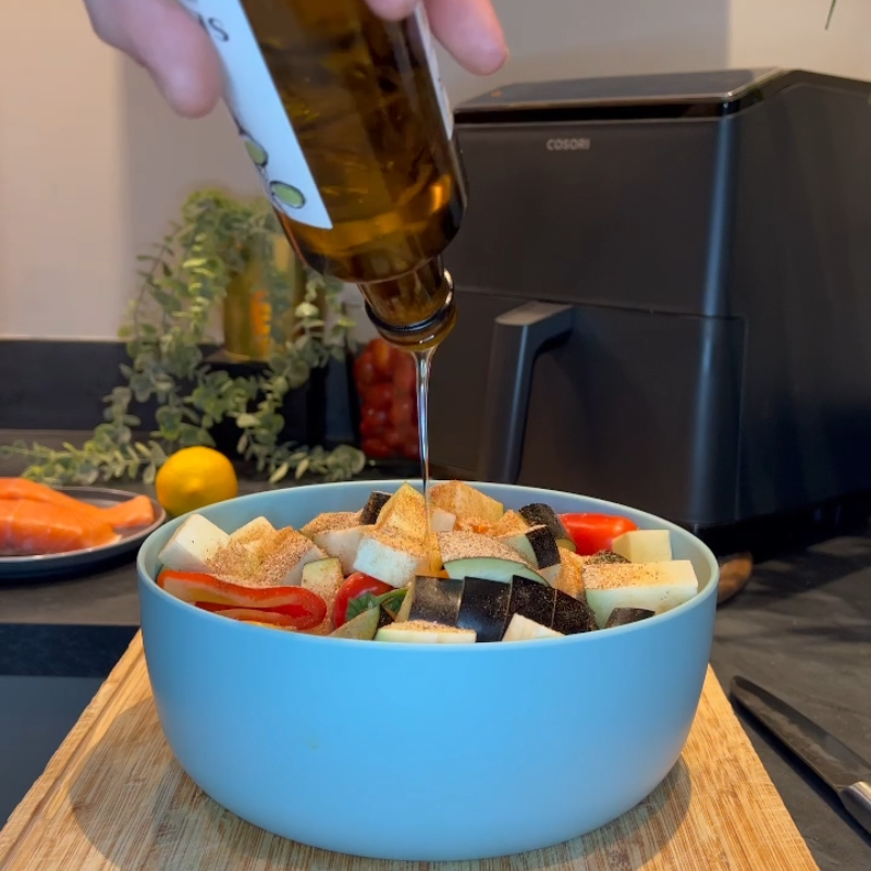 - Besprenkel de blokjes met een eetlepel olijfolie.