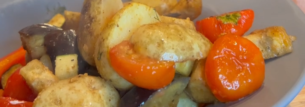 - Meng alle kruiden en bestrooi de groenten en de krieltjes met de kruidenmix.