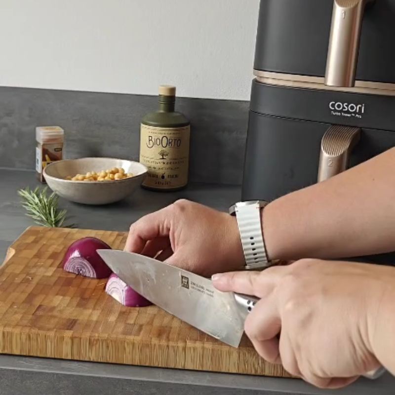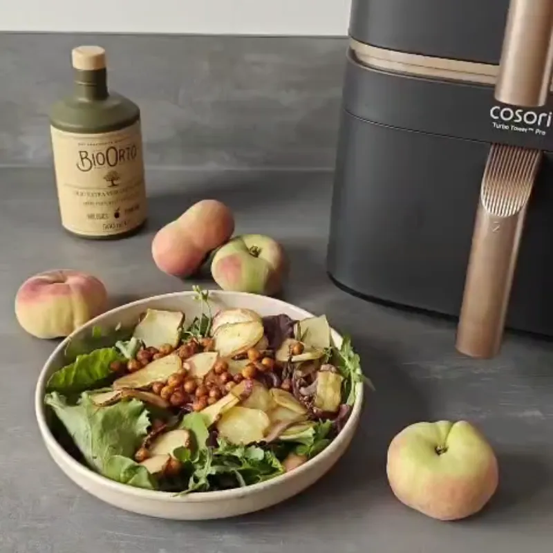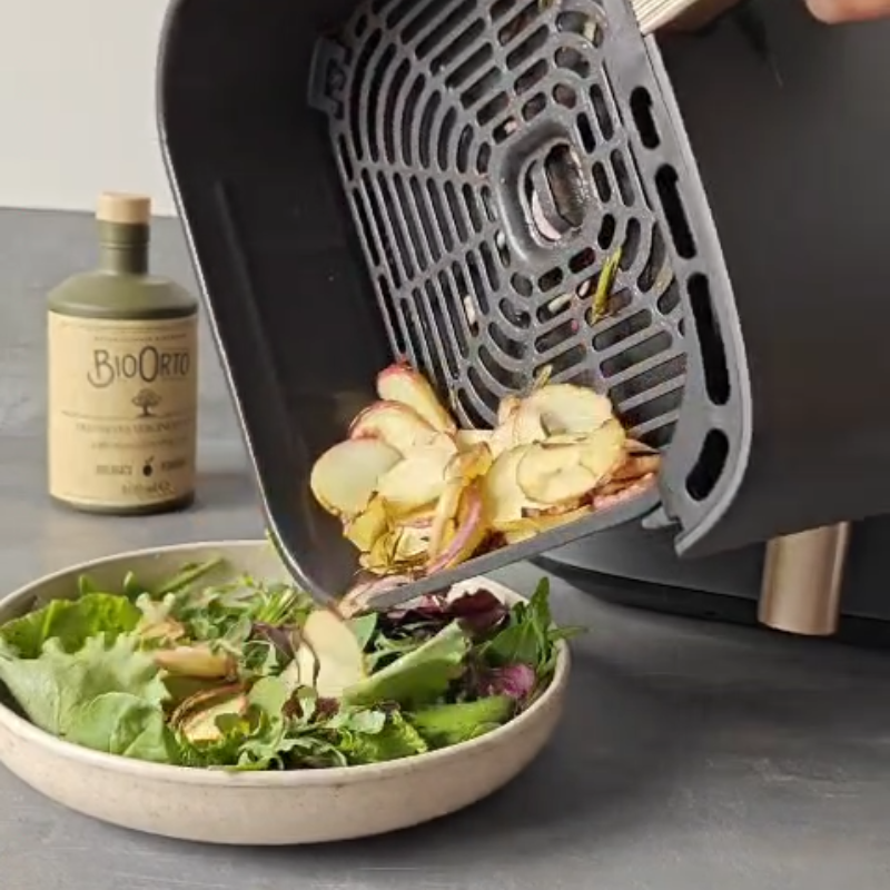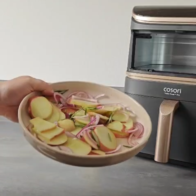Plaats deze mix in de bovenste mand van de airfryer en kies voor stand "Airfry" op 190°C voor 8 à 10 min, tot alles zacht en licht gekaramelliseerd is.