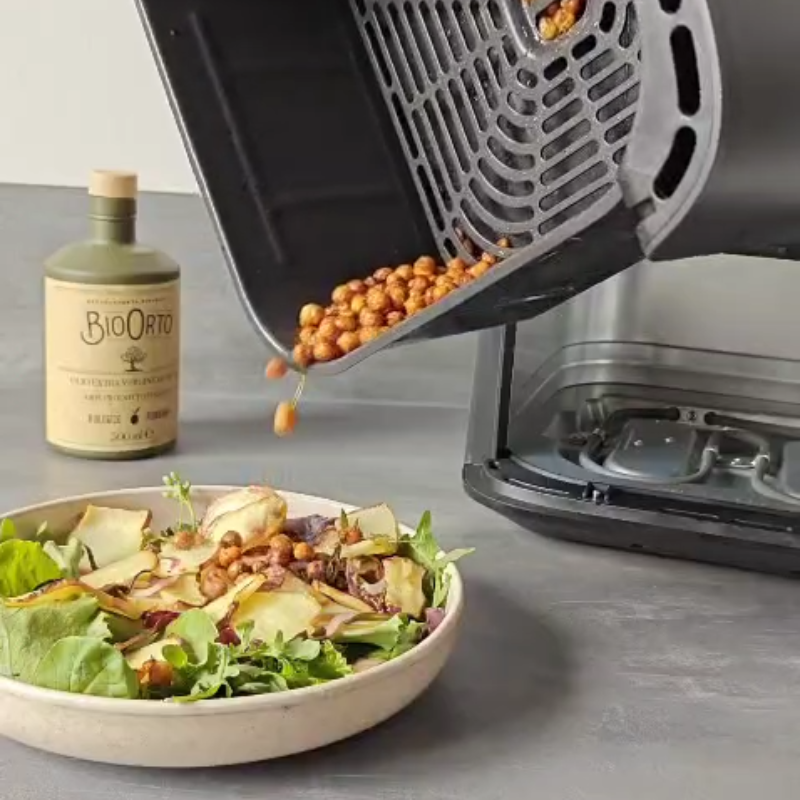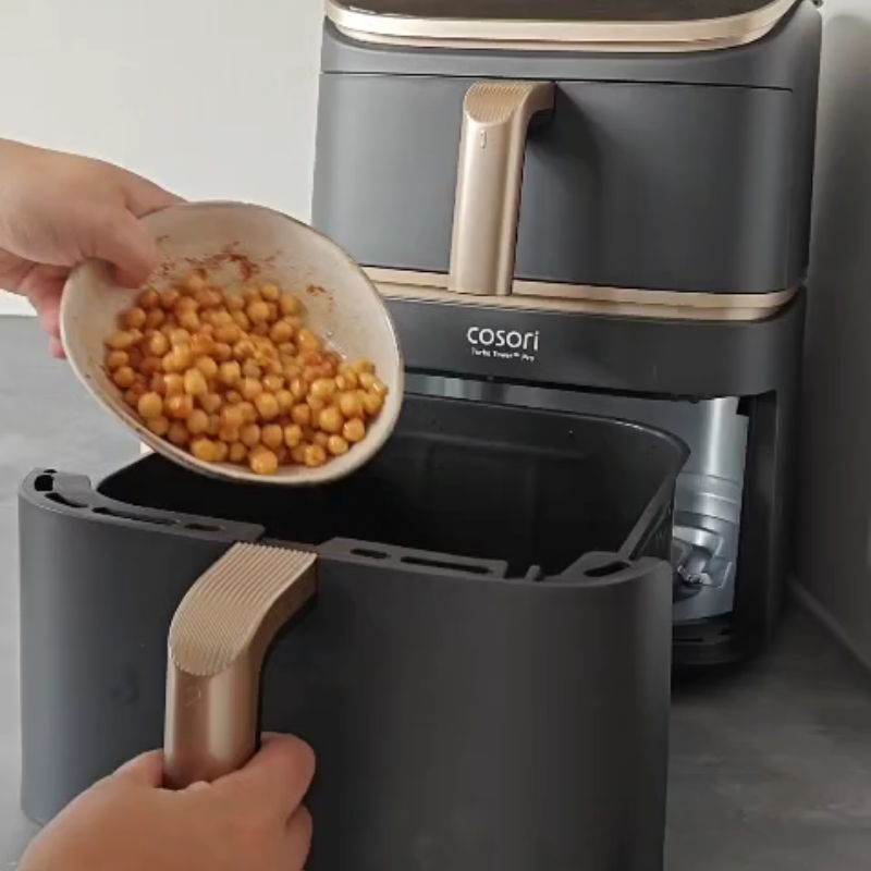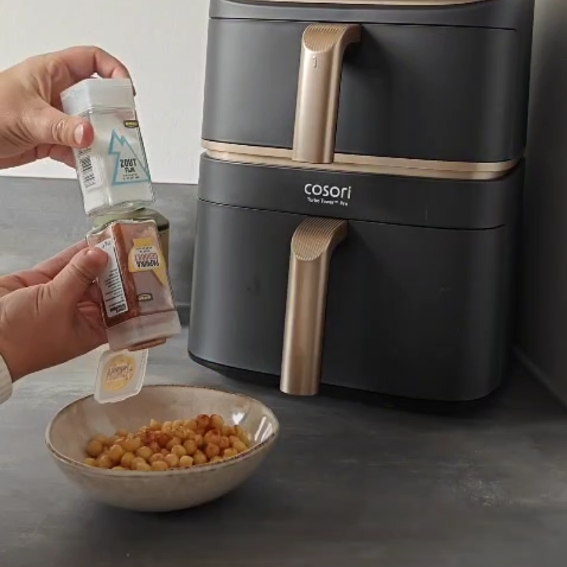 Meng de kikkererwten met de olijfolie en het paprikapoeder. - Airfry deze in de onderste mand op 200°C voor 15 min. Schud ze eventueel halverwege even om.